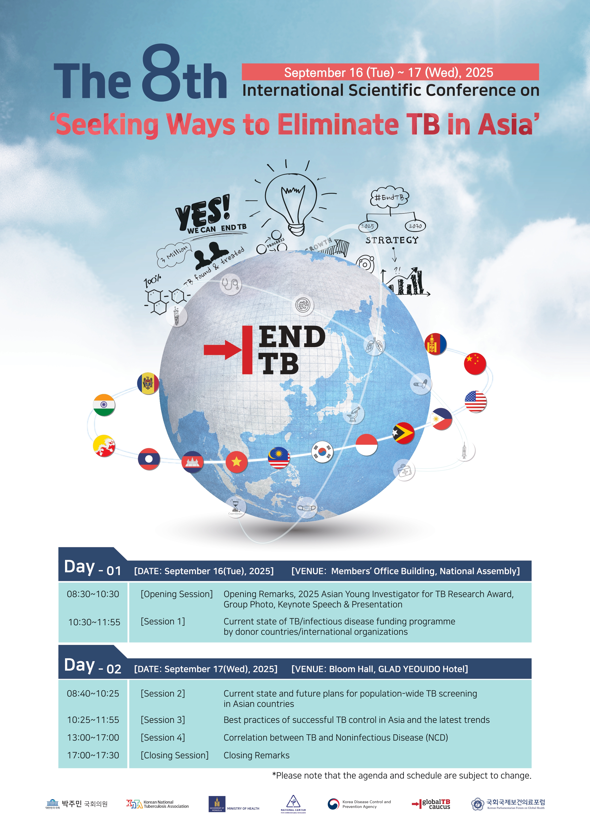 | Closing Remarks | 17:05–17:25 | Gyeongin Lee, Director, Korean Institute of Tuberculosis, KIT Lucica Ditiu, Secretary General, Stop TB Partnership (Video) Sereenen Enkhbold, General Director, National Center for Communicable Diseases (NCCD), Mongolia |